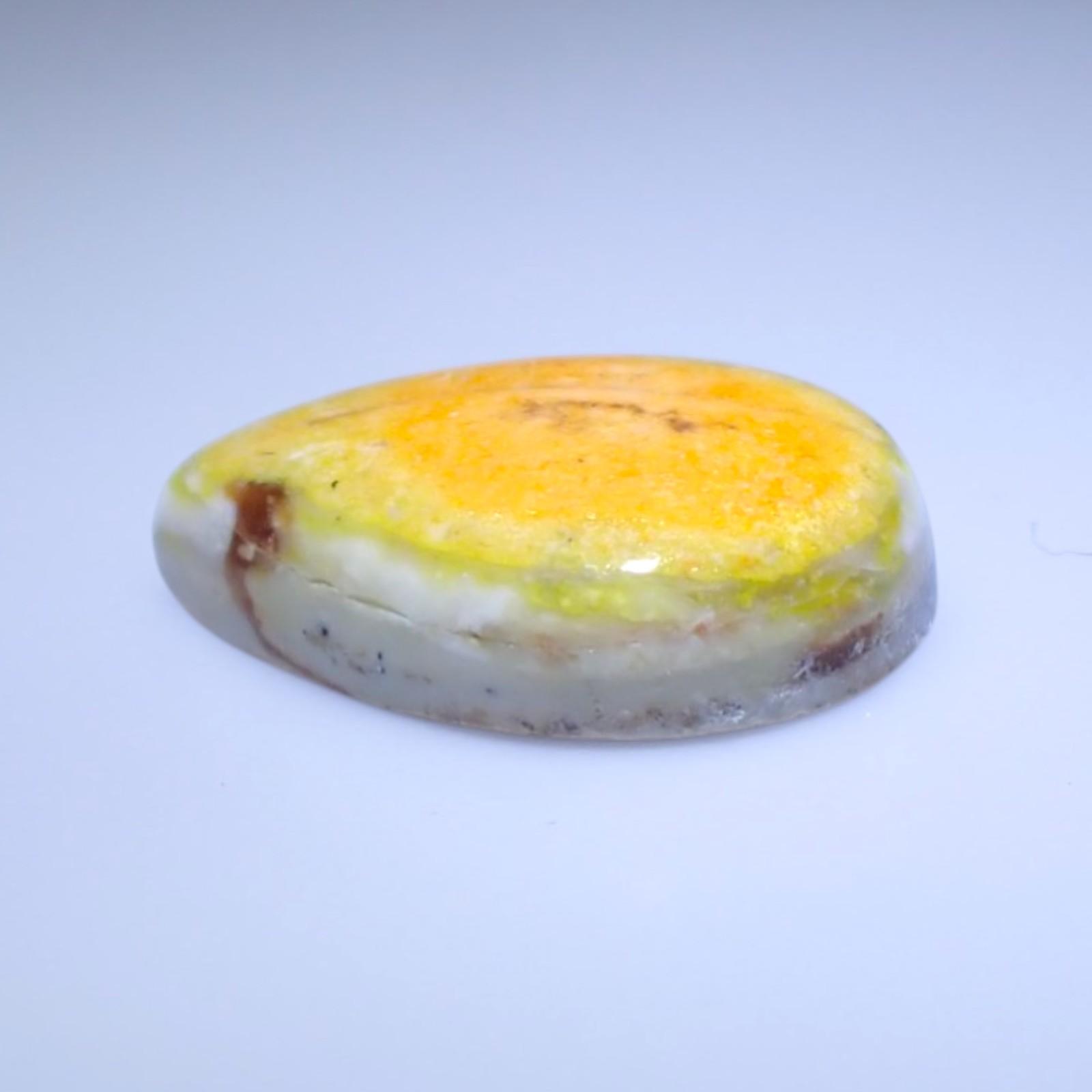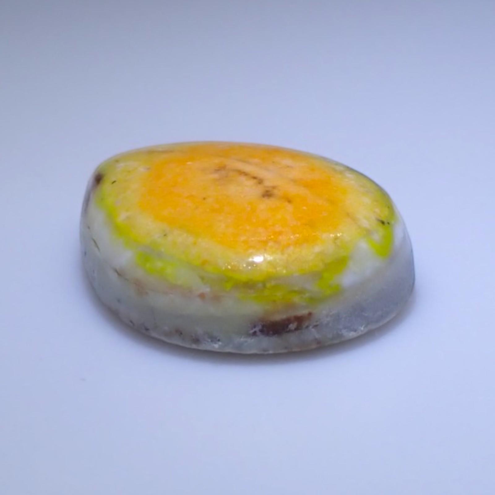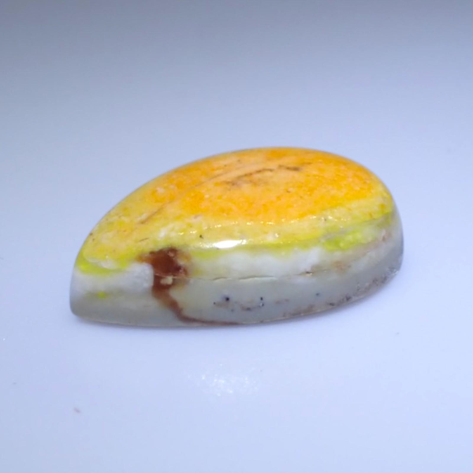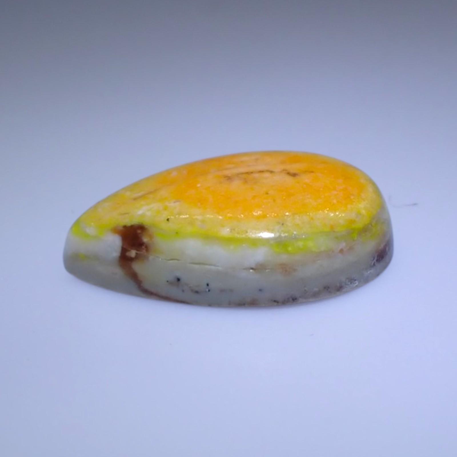 Description: Forcherite is a variety of common opal (amorphous hydrated silica) that is colored by fine, dispersed inclusions of Realgar and Orpiment. It sits at a 5.5 to 6.5 on the Mohs scale, typical for high-quality common opal. It is characterized by its vitreous to waxy luster and its striking yellow, orange, and reddish-orange body color.