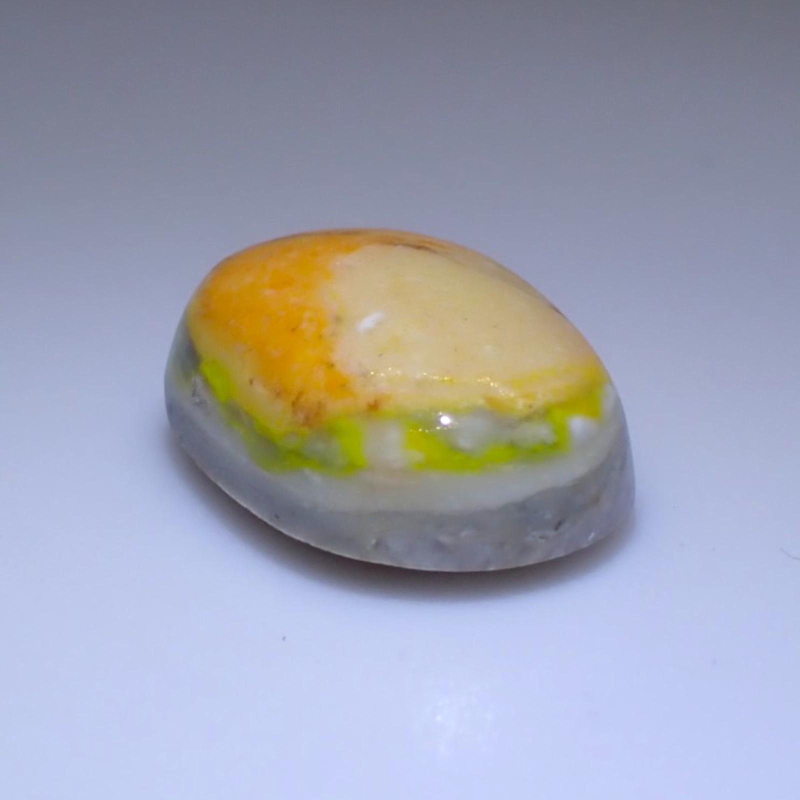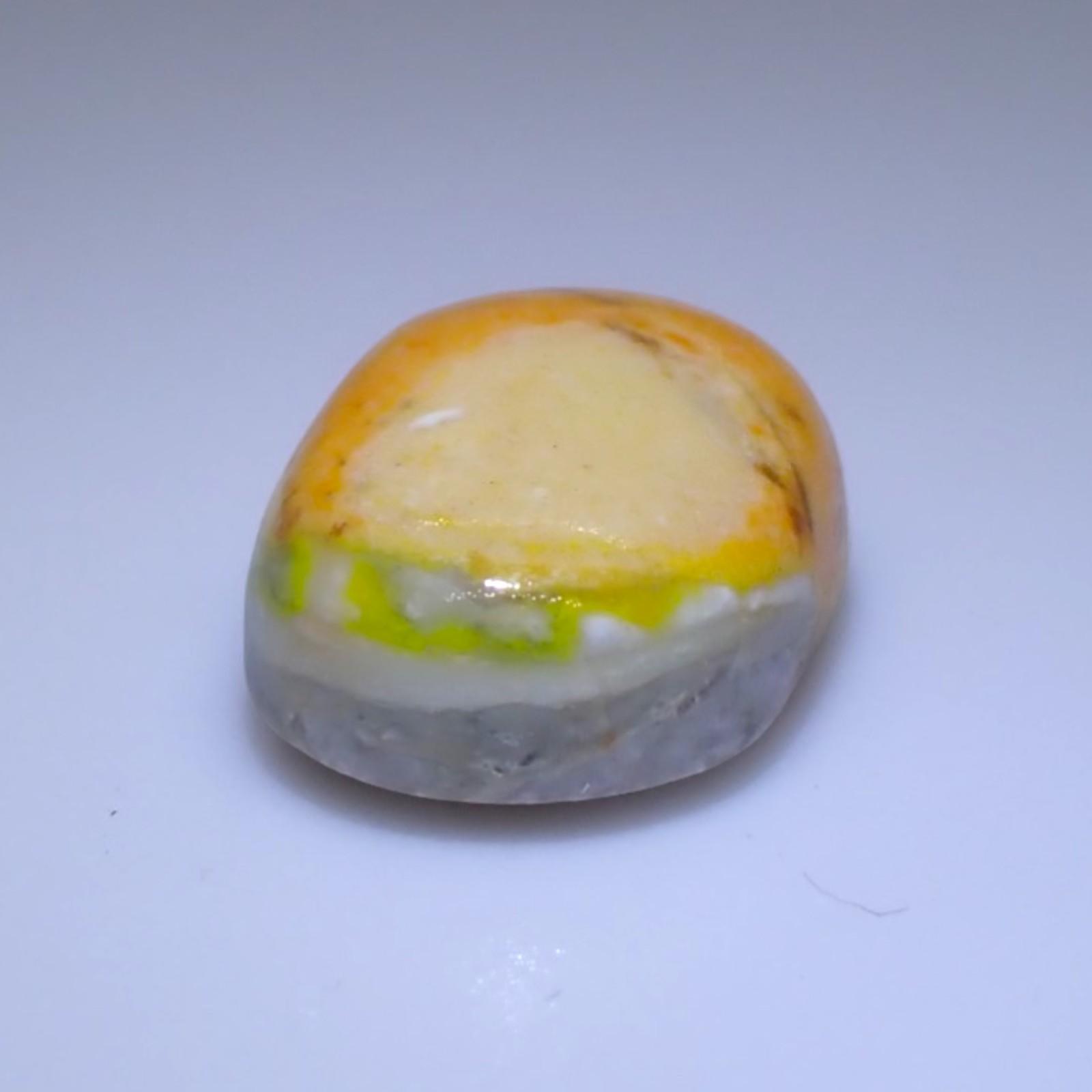 Description: Forcherite is a variety of common opal (amorphous hydrated silica) that is colored by fine, dispersed inclusions of Realgar and Orpiment. It sits at a 5.5 to 6.5 on the Mohs scale, typical for high-quality common opal. It is characterized by its vitreous to waxy luster and its striking yellow, orange, and reddish-orange body color.